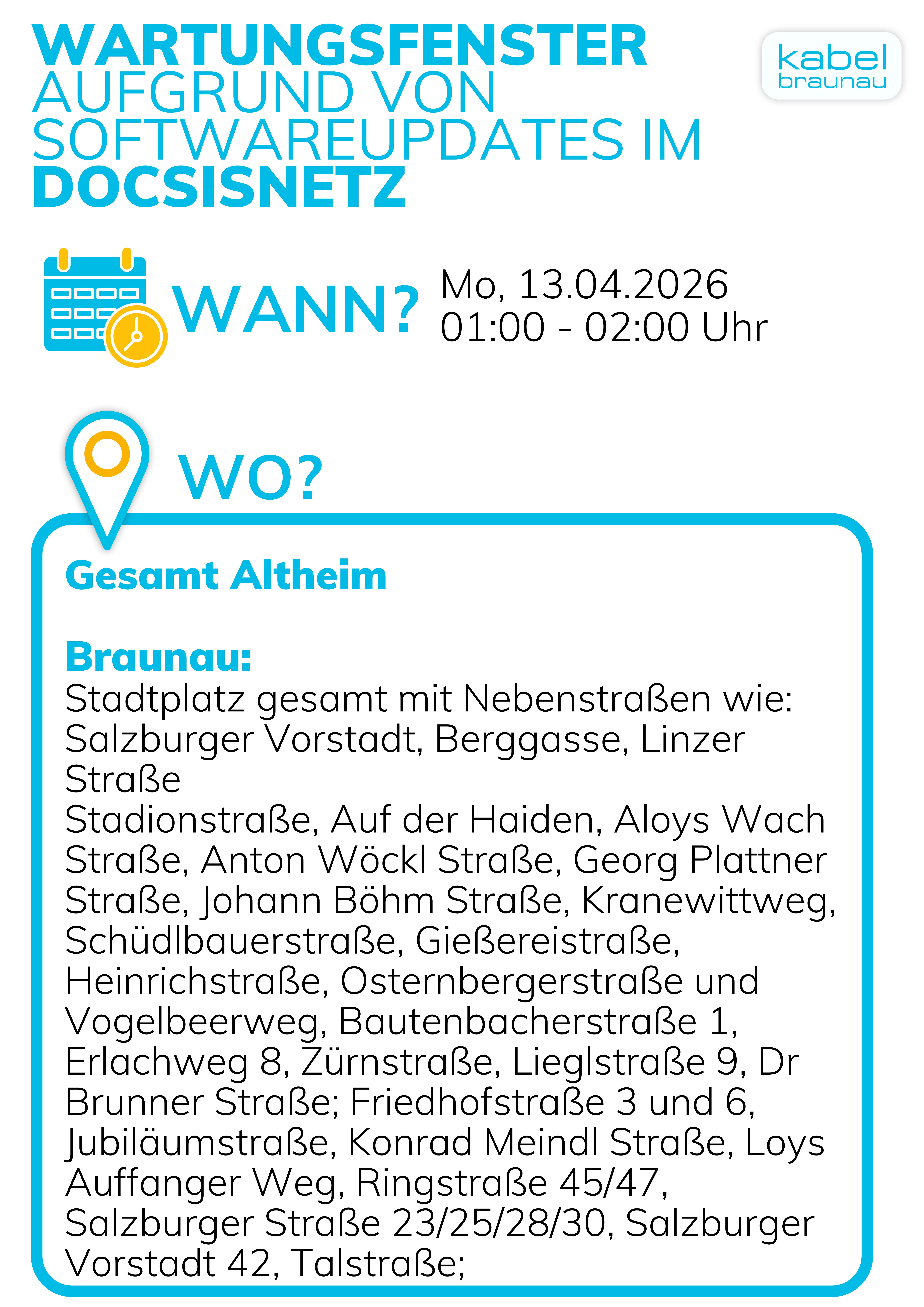 Wir sind der lokale TV-, Internet- und Telefonie-Provider, der mit Kompetenz und Lösungen rund um das beste Breitbandnetz & Glasfasernetz gerne für Sie zur Verfügung steht. Unsere Produkte sind im eigenen Netz in Braunau, Ranshofen und Altheim, im Netz vom Glasfaser Verbund, sowie im Fibernetz in einigen Bereichen Oberösterreichs verfügbar.